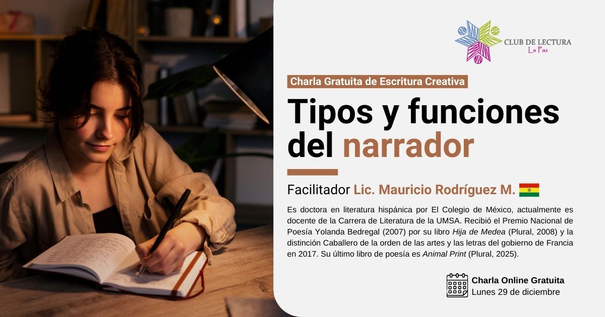 En esta charla 100% virtual analizarás las clasificaciones clásicas de la voz narrativa (omnisciente, protagonista, testigo, equisciente) para entender cómo cada una afecta la entrega de información al lector. Aprenderás a identificar las funciones del narrador para decidir con criterio técnico quién debe contar tu historia. Finalmente,...